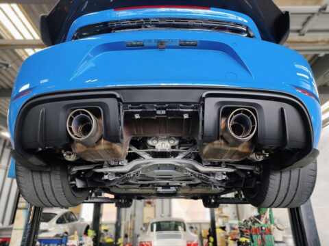 今回はとても鮮やかなトリトンブルーの718ケイマンGT4RSが車検で入庫しました。