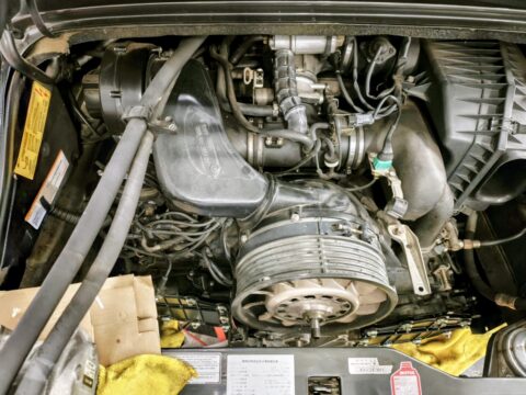 車検点検でご入庫いただいた 993型カレラ に、エンジンのチェーンケースカバーからオイル漏れが確認されました。