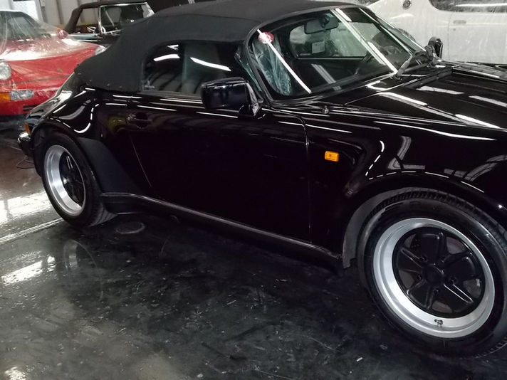 930スピードスター、コーティング完了です。 2012年5月27日 作業事例 いかがでしょうか・・・・さすがにペルマガードですね〜 濡れ羽色とでもいいましょうか・・・・濡れたようなツヤで、とても20年選手とは思えないボディーです。 ますますセクシーに・・・・ツルンと丸っこい大きめのオシリがいいですね〜 ワイドフェンダーの迫力も復活!シルバーのリムに、ボディー同色のディスクが素敵です。 バットモビル出撃準備完了です!